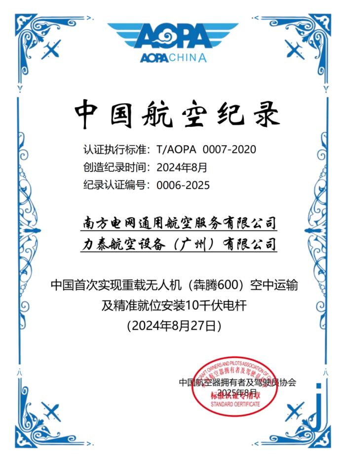 2025年7月29日,中国航空器拥有者及驾驶员协会(中国AOPA)正式发布认证编号为0006-2025的航空纪录,确认“中国首次实现重载无人机(犇腾600)空中运输及精准就位安装10千伏电杆”的里程碑式突破。该纪录由南方电网通用航空服务有限公司(以下简称“南网通航”)与力泰航空设备(广州)有限公司(以下简称“力泰航空”)联合创造,标志着我国电力行业在配网基建机械化、智能化领域迈出关键一步。